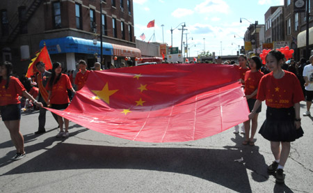 People hold national flags of the People's Republic of China during a parade in Chinatown of Chicago, the United States, on Sept. 27, 2009. (Xinhua/Hu Guangyao)