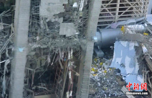 3月16日,由日本自衛(wèi)隊(duì)員在直升機(jī)上拍攝的福島第一核電站第四反應(yīng)堆受損近照。