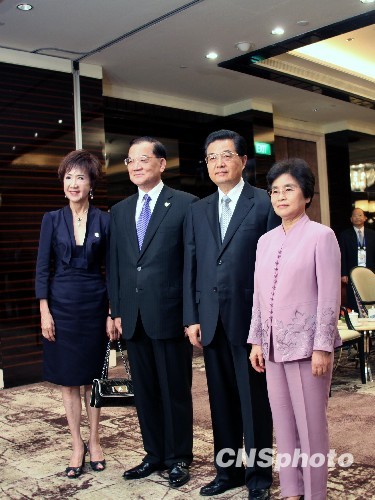 11月14日上午,中共中央總書記胡錦濤在新加坡會見中國國民黨榮譽主席連戰。圖為胡錦濤和夫人劉永清與連戰和夫人連方瑀合影。 中新社發 周兆軍 攝