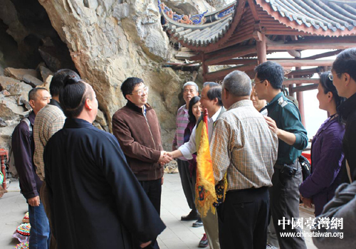 陳福林一行與臺灣游客在乾元山金光洞前合影留念。(圖片來源:綿陽市臺辦)