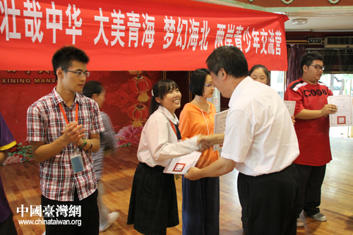 北京市臺辦副主任高振生向本次交流營活動表現(xiàn)優(yōu)異的學(xué)生頒發(fā)證書(中國臺灣網(wǎng) 趙輝 攝)
