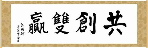 臨行時(shí),江丙坤欣然提筆抒寫“共創(chuàng)雙贏”四字同大家共勉。