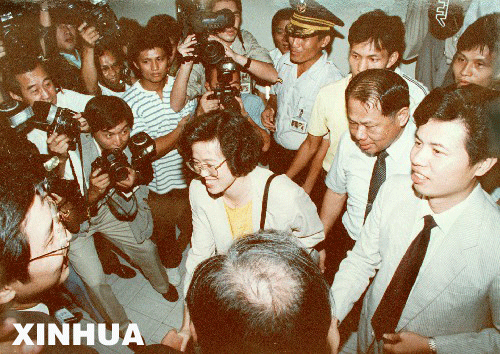 1991年8月12日,新華社記者范麗青(女)作為大陸到臺(tái)灣采訪的第一批記者在臺(tái)北機(jī)場受到臺(tái)灣新聞界的歡迎和采訪。