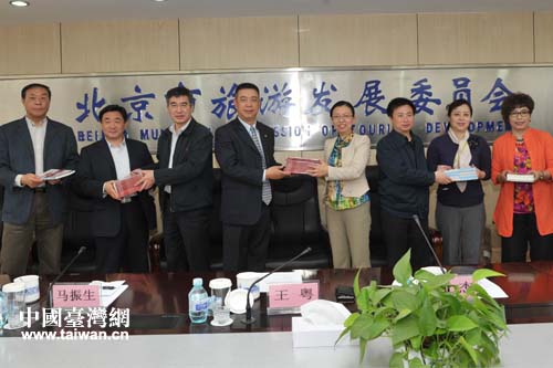 中國臺灣網4月2日北京消息 4月1日,來自北京市接待臺灣游客的旅行社負責人、導游聚集一堂,參加《寶島游客逛北京》發書儀式。北京市旅游發展委員會副主任王粵、北京市人民政府臺灣事務辦公室副巡視員馬振生、北京市人民政府新聞辦公室副主任白杰出席。市旅游委、市臺辦有關部門領導、工作人員,國旅總社、中國旅行社總社(北京)有限公司、中青旅、春秋旅行社、康輝旅行社、凱撒國旅、新華國際旅行社、眾信旅行社、海峽旅行社、北京中國國際旅行社、中信旅游、神舟國際旅行社、環境國際旅行社等旅行社負責人、導游約40人參加了發書儀式。