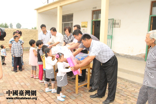 為小朋友們贈送節日禮物。(圖片來源:東營臺辦)