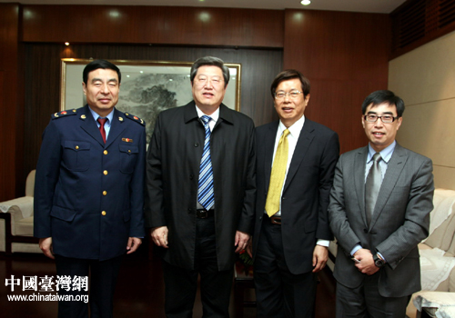 山東省政府特邀咨詢張建國(左二)、省工商局局長牛啟忠在晚會前與臺灣來賓合影。(圖片來源:山東省臺辦)