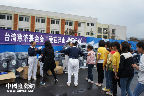 臺灣慈濟(jì)慈善基金會在雅安蘆山地震災(zāi)區(qū)開展“愛在蘆山 關(guān)懷行動”,向災(zāi)區(qū)學(xué)生捐贈學(xué)習(xí)生活用品。(圖片來源:四川省臺辦)