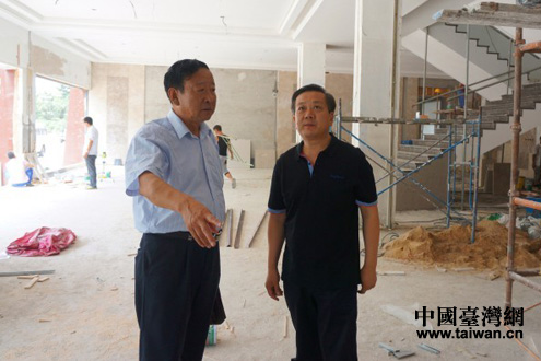 威海市臺辦主任于連波(右一)在市臺聯會會長戚明安(左一)的陪同下考察臺灣會館。(圖片來源:威海市臺辦)
