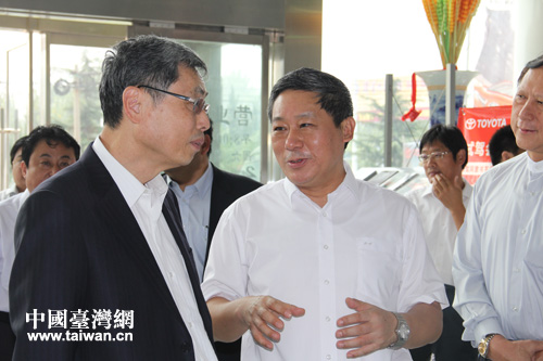 高孔廉(左)在棗莊市市長張術(shù)平陪同下考察臺(tái)資企業(yè)。(圖片來源:棗莊市臺(tái)辦)