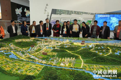 張嘉(右四)為參觀高要規劃館的臺灣客商們介紹高要市城區規劃發展。(圖片來源:肇慶市臺辦)