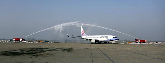 12月31日,威海機(jī)場(chǎng)打出水門迎接來(lái)自臺(tái)北桃園機(jī)場(chǎng)的首航客機(jī)