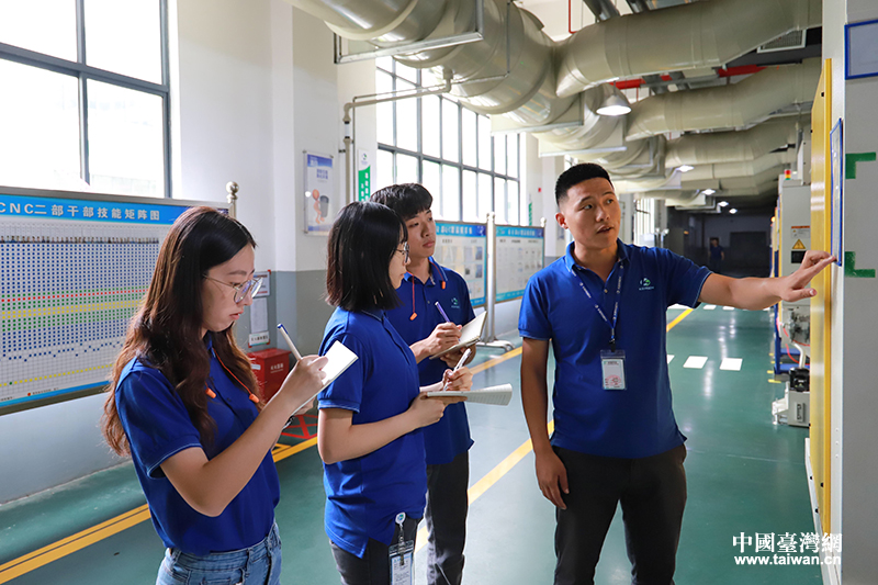 臺(tái)灣實(shí)習(xí)生聽(tīng)取環(huán)鴻電子企業(yè)老師介紹現(xiàn)代化機(jī)械設(shè)備。(圖片來(lái)源:昆山市臺(tái)辦)