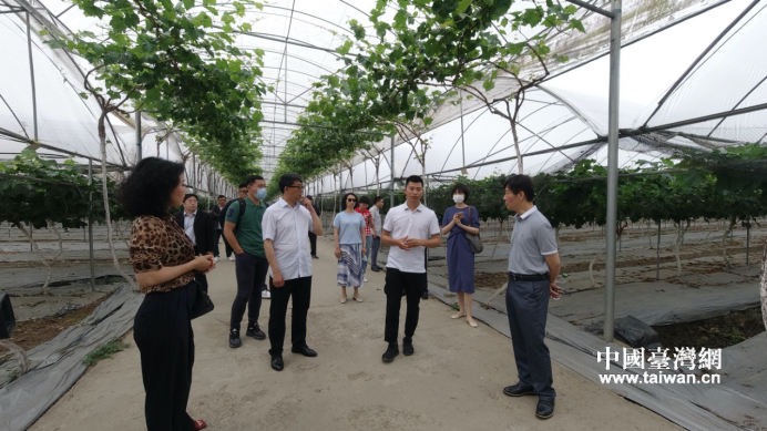 臺(tái)資農(nóng)企負(fù)責(zé)人、農(nóng)業(yè)專家在彭山區(qū)葡萄產(chǎn)業(yè)現(xiàn)代農(nóng)業(yè)園區(qū)交流葡萄種植技術(shù)。(圖片來源:四川省臺(tái)辦)