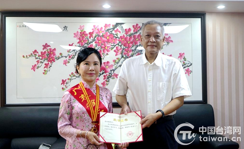 臺胞翁秋梅獲頒“廣東省三八紅旗手”榮譽證章(圖片來源:廣東省臺辦)