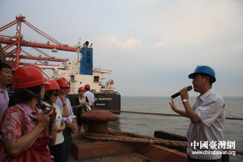 參加“第四屆海峽兩岸企業(yè)發(fā)展與合作論壇”的嘉賓和代表在曹妃甸礦石碼頭聽取工程師的介紹。(中國臺(tái)灣網(wǎng) 肖燕 攝)