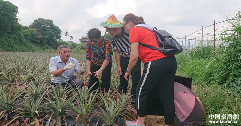 大樹休閑農(nóng)業(yè)園區(qū)理事長謝坤淞介紹鳳梨種植情況。(圖片來源:河池市臺辦)