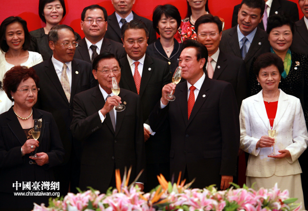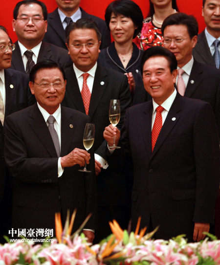 6月29日下午,海協(xié)會與臺灣海基會在重慶順利簽署兩岸經(jīng)濟合作框架協(xié)議(ECFA)以及兩岸知識產(chǎn)權保護合作協(xié)議。圖為陳云林、江丙坤舉杯互致慶賀。(中國臺灣網(wǎng) 鐘寶華 攝)