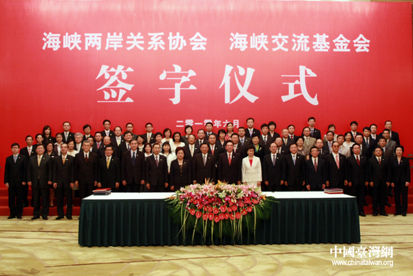 海協(xié)會會長陳云林、海基會董事長江丙坤同出席此次商談的兩會代表團成員在簽字儀式上合影留念。(中國臺灣網(wǎng) 鐘寶華 攝)