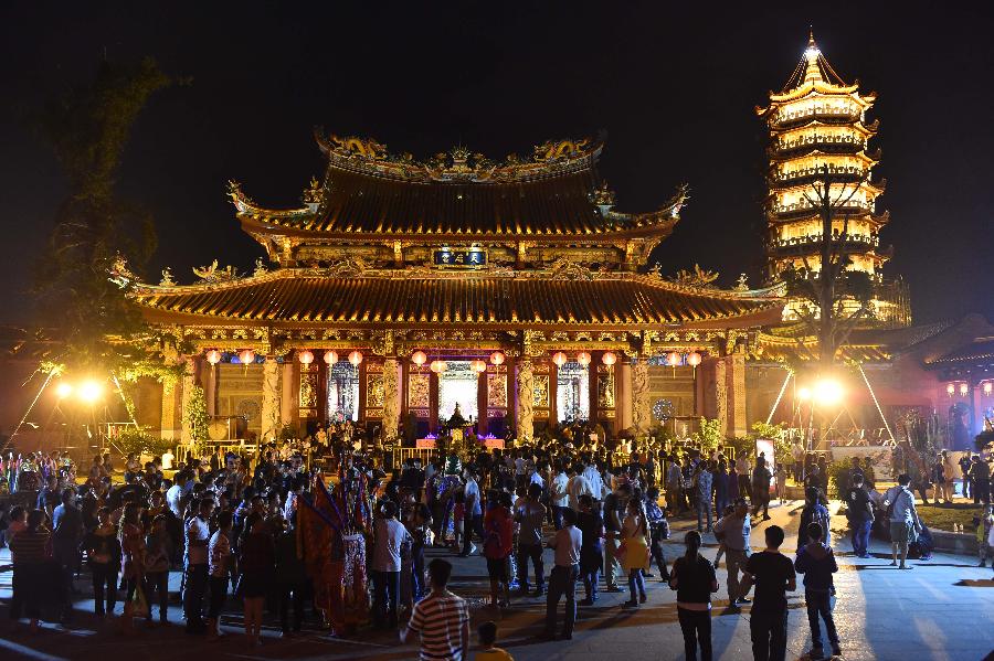 9月23日,昆山臺胞和當地居民在燈會上觀看演出。當日,2015年海峽兩岸昆山中秋燈會在江蘇昆山慧聚寺廣場亮燈,燈會洋溢著濃郁的兩岸風情,吸引了眾多昆山臺胞和當地居民前來觀賞。新華社發(王須中 攝)