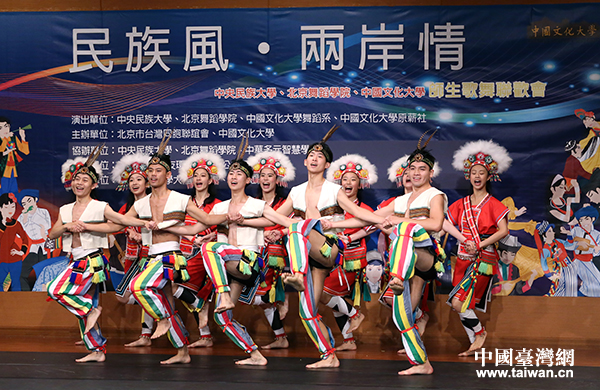 3日晚間,第四屆兩岸族韻喜福匯暨兩岸少數民族大聯歡演出活動在中國文化大學舉行,兩岸少數民族青年同臺演出。圖為中國文化大學舞蹈系同學表演阿美族豐年祭舞。(中國臺灣網 普燕 攝)