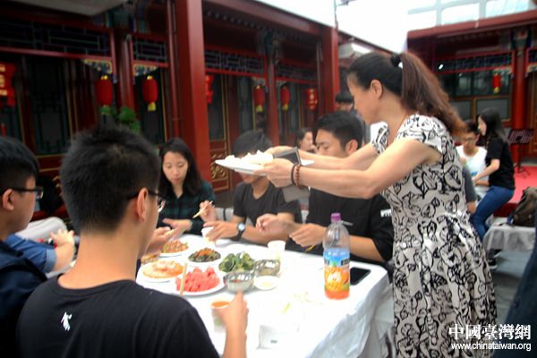好客的北京社區居民包了四種餡的餃子歡迎客人,請來了剪紙、糖人、面人、京劇臉譜等非物質文化遺產傳承人與兩岸青年互動體驗,一同制作具有北京特色的紀念品,并和兩岸青年一起聯歡表演文藝節目,最后,臺灣大學生幾人一組,到社區居民家中做客,了解胡同文化,進行互動交流。