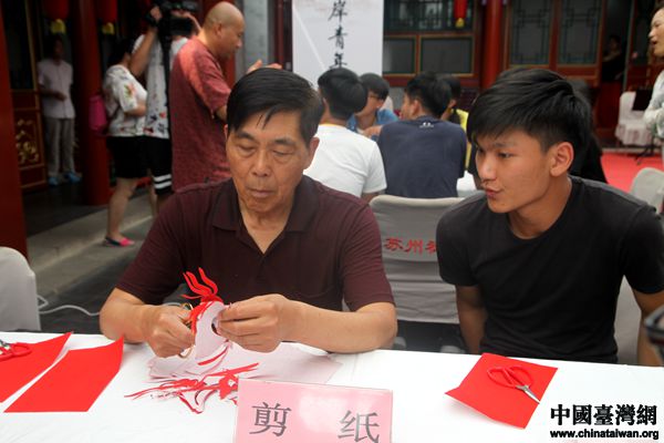 臺灣大學生向非物質文化遺產傳承人學習剪紙。(中國臺灣網 李杰 攝)