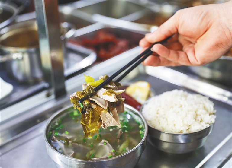 陳大姐賣辣湯飯的環境也在改變。她一開始是推著車子賣,那時候像她一樣的小販很多,所以每天早上水巷口的路都被堵得死死的。后來政府加強管理,不允許流動擺攤,她就花錢租下了一個小店,但小店后來成了危房。危房翻修時,她找到了現在這個面積更大的新店,衛生環境改善了許多,樓上樓下兩層,能同時容納近百人用餐。“和我一樣的人還有很多,大家隨著街道的改變越過越好,但不變的是食物的口味!标惔蠼阏f。
