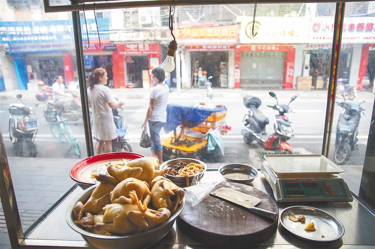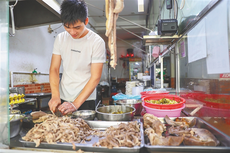 “我們已經在這里做了40多年了,算是干了一輩子了!毙〉甑牟AЧ褡永,展示著還冒著熱氣的白斬雞——黃澄澄的雞皮色澤油亮,勾人食欲。店主蘭姨笑容滿面,時常和食客閑聊幾句。