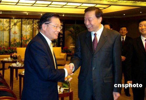一月十日午間,江蘇省長羅志軍在南京金陵飯店會見臺灣海基會董事長江丙坤,以及海協會與海基會聯合參訪團一行。 中新社發 丁梅 攝