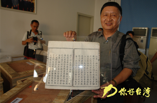 廖運(yùn)塘董事長為報(bào)道團(tuán)展示到臺(tái)灣展覽的客家族譜展品。(你好臺(tái)灣網(wǎng) 陳黎琴 攝)