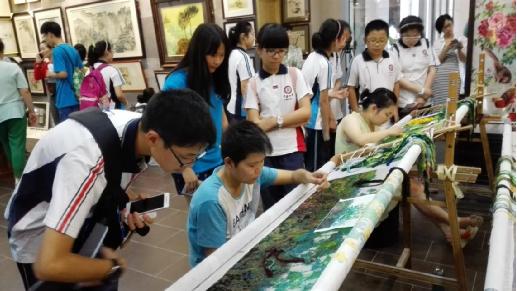 帶著種種揣測(cè),海峽兩岸的營(yíng)員們來(lái)到丹陽(yáng)金鷹國(guó)際商城。在正則繡藝術(shù)有限公司門(mén)店內(nèi),四周墻面上掛滿了精美的繡品,有充滿古韻的仿國(guó)畫(huà)山水,有動(dòng)感十足的各種動(dòng)物,還有各式裝飾品。幾位年輕的刺繡人員正在現(xiàn)場(chǎng)創(chuàng)作,一針一線是那么優(yōu)雅……第一次來(lái)到江蘇丹陽(yáng),見(jiàn)到這么漂亮的刺繡,令我難以忘懷!臺(tái)北市興雅中學(xué)學(xué)生蔣皓羽發(fā)出這樣的感嘆。前來(lái)觀展的方家璇同學(xué)說(shuō):雖然我是江蘇人,但是從沒(méi)見(jiàn)過(guò)正則繡。這次看過(guò)展覽后感觸很大,最大的感覺(jué)就是正則繡的針線細(xì)膩,遠(yuǎn)遠(yuǎn)超出我的想像。它就像筆一樣,能代替筆墨畫(huà)出美麗的圖案。”同樣感到驚奇的還有來(lái)自臺(tái)灣的老師和家長(zhǎng),興雅中學(xué)的梅老師說(shuō):“正則繡的繡工很細(xì),對(duì)耐力是一個(gè)考驗(yàn),更讓人敬偑的是這些繡師都是聽(tīng)障人員,他們值得稱贊和尊敬!睆呐_(tái)灣來(lái)的學(xué)生家長(zhǎng)金女士說(shuō):“這個(gè)夏令營(yíng)活動(dòng)很有意義,之前參觀的都是些文物、景點(diǎn),這次參觀的是手工藝品,感覺(jué)很不一樣。孩子從中也可以感受到手工操作的不容易,同時(shí)也可以鍛煉他們的創(chuàng)造性思維,值得他們好好學(xué)習(xí)!