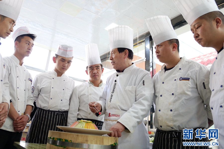 透過櫥窗,范增福和他的徒弟們正在廚房里準備食材。新華網 王小龍攝
