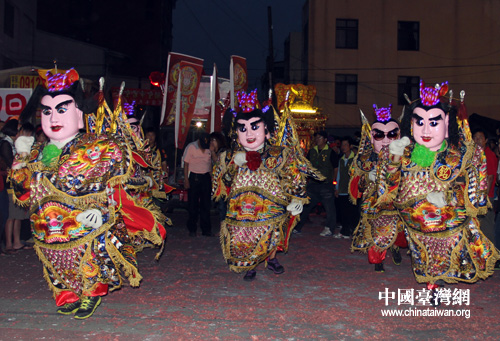 中國臺灣網(wǎng)4月4日臺南消息 鑼鼓喧天、鞭炮齊鳴,臺南近30家關(guān)廟用當?shù)靥厣拿袼祝в轿鬟\城明朝關(guān)公圣像駐駕臺南鹽水武廟。跳《江南style》的電音三太子、秀鋼管舞的臺南辣妹、放大陸流行的《最炫民族風(fēng)》的花燈車隊等,讓巡游現(xiàn)場“嗨翻天”。