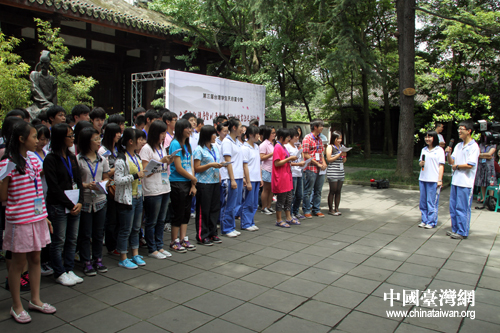 中國臺灣網(wǎng)7月4日成都消息 7月4日下午,參加第三屆“臺灣學(xué)生天府夏令營”活動(dòng)的105名師生與成都七中的學(xué)生們一道漫步杜甫草堂,聽取巴蜀文化講座,共同吟誦“詩圣”杜甫的名篇佳作,感受中華文化源遠(yuǎn)流長。