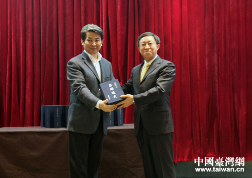 臺(tái)海出版社社長(zhǎng)馬鐵向國(guó)臺(tái)辦新聞局局長(zhǎng)楊毅贈(zèng)書。(中國(guó)臺(tái)灣網(wǎng) 王怡然 攝)