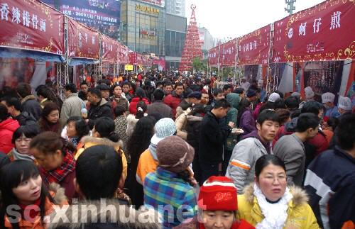 1月2日,在成都市萬達廣場,臺灣小吃攤位生意紅火。 新華社記者 江宏景 攝 1月1日,2009成都臺灣風情周在成都萬達廣場拉開帷幕,130個小吃攤位、30多種臺灣小吃現做現賣,還有臺灣民間藝人的風情表演,現場游人絡繹不絕。 1月2日,幾位成都市民在采購年貨。隨著春節的臨近,許多市民利用元旦假期開始選購年貨,為過農歷新年做準備。 新華社記者 江宏景 攝