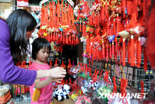 5月19日,一名小朋友在臺北市街頭選購端午香包。端午節臨近,各式各樣的香包在臺北上市,熊貓造型的香包尤其受到孩子們喜愛。新華社發(吳景騰 攝)