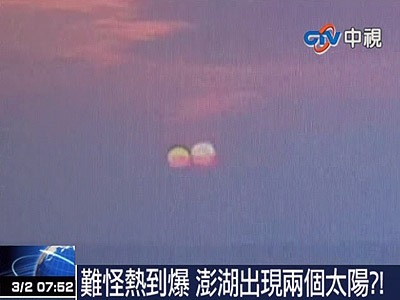 據報道,臺灣網絡近日瘋傳一組澎湖“兩個太陽”的奇異照片。照片當中,好像真的出現兩個太陽,相偎相依,網友稱之為奇特的“太陽雙胞胎”景象。有網友表示,“莫非太陽也有分身術,難道天真有異象嗎?”