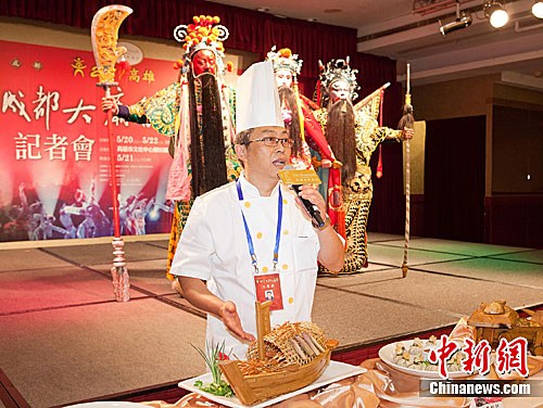 歷史悠久的“成都大廟會”將于5月20日起在臺灣高雄文化中心圓形廣場連辦3天,以四川最具代表性的民間工藝、歌舞雜技、川劇變臉、特色小吃等,向臺灣民眾呈現天府之國的人文歷史與民俗風情。圖為5月19日的記者會上,廚師展示麻辣美食。中新社發 路梅 攝