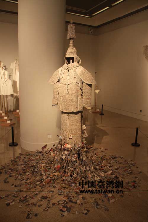 “交互視象——2013海峽兩岸當(dāng)代藝術(shù)展”在中國美術(shù)館亮相,大陸藝術(shù)家的作品“戰(zhàn)利品”是用手紙和報紙制作的(中國臺灣網(wǎng) 蕪?fù)?攝)