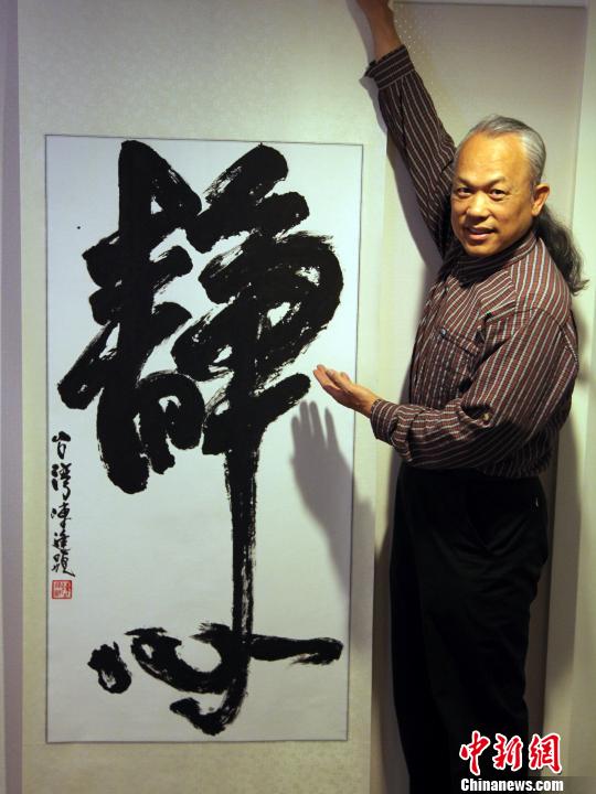 圖為2014新北市美術(shù)家聯(lián)展。臺灣知名藝文家陳逢顯與他參展的書法作品“靜心”。 陳立宇 攝