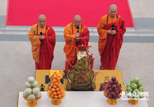 臺灣佛光山寺住持心保和尚恭讀星云法師《為社會大眾祈愿文》。(中國臺灣網 李典典 攝)