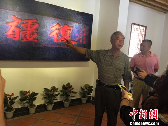 27日上午,臺灣抗日志士李友邦事跡圖片展暨座談會,在其祖居地廈門集美兌山社區(qū)舉行。圖為李友邦之子李力群在介紹李友邦著名的“復(fù)疆”石刻拓片 陳悅 攝