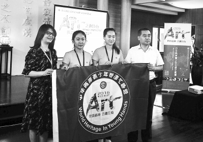22日,由海峽兩岸婚姻家庭協(xié)會主辦的中華兩岸青少年世遺藝趣營在江蘇蘇州開營。約60名兩岸青少年將在為期一周的活動中,走近非物質文化遺產(chǎn),體驗傳統(tǒng)手工技藝,感受蘇州園林之美。圖為開營儀式上舉行授旗活動。新華社發(fā)