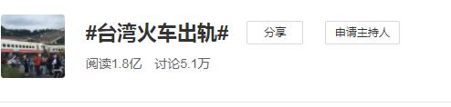 與此同時,大陸網友對此事件也高度關注,#臺灣火車出軌#話題更在第一時間登上熱搜,截止發稿時,該話題閱讀量已達1.8億次、被討論5.1萬次。
