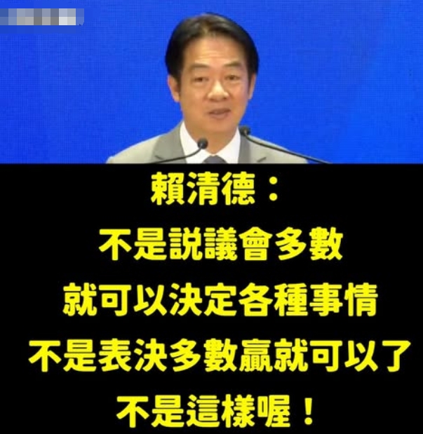 第三講中,賴清德更是重新定義了“民主”。他宣稱,“民主不是表決多數(shù)贏就可以”“不是議會(huì)多數(shù)就可以決定任何事情”,擺明在挑戰(zhàn)全臺(tái):雖然藍(lán)白占多數(shù),但表決通過(guò)不算數(shù)。有網(wǎng)友替賴清德翻譯:只有他說(shuō)的才算,這才是“真民主”。