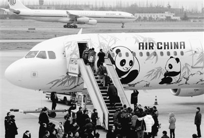 2009年1月,國航西南分公司熊貓彩繪春運包機從成都首航臺北。資料圖片
