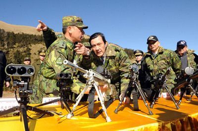 人民網(wǎng)報道:馬英九14日前往合歡山武嶺視察臺灣陸軍特訓中心武嶺寒訓基地,慰問受訓士兵并參觀特訓中心各式雪地狙擊所使用的特殊裝備。
