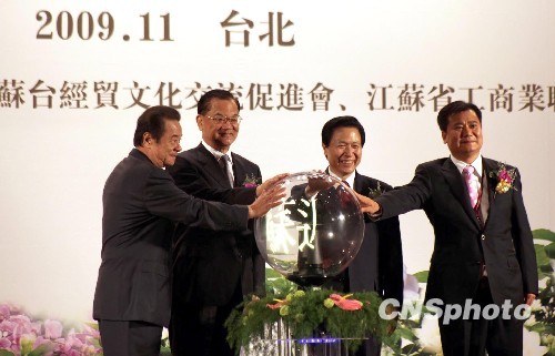 11月10日,中共江蘇省委書記梁保華、中國(guó)國(guó)民黨榮譽(yù)主席連戰(zhàn)等在臺(tái)北為“臺(tái)灣江蘇周”暨首屆臺(tái)蘇經(jīng)貿(mào)合作論壇揭幕。(圖片來(lái)源:中新社)