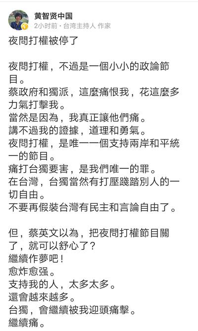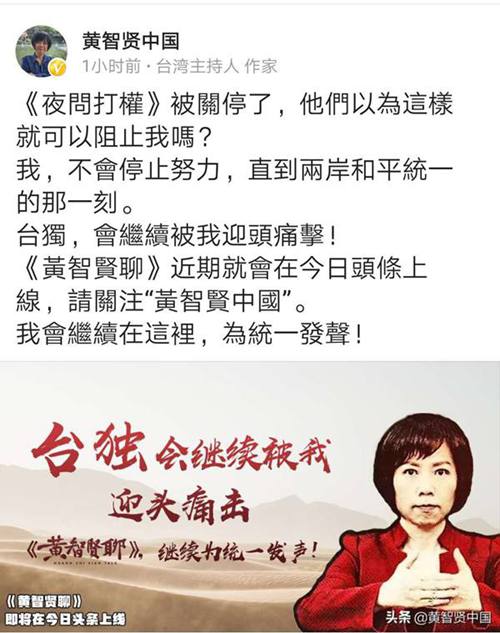 6月27日上午,臺灣知名媒體人黃智賢在網(wǎng)絡平臺發(fā)文說,她主持的政論節(jié)目《夜問打權》被停播了,“蔡當局和‘獨派’這么痛恨我,花這么多力氣打擊我,當然是因為我真正讓他們痛,他們講不過我的證據(jù)、道理和勇氣。”